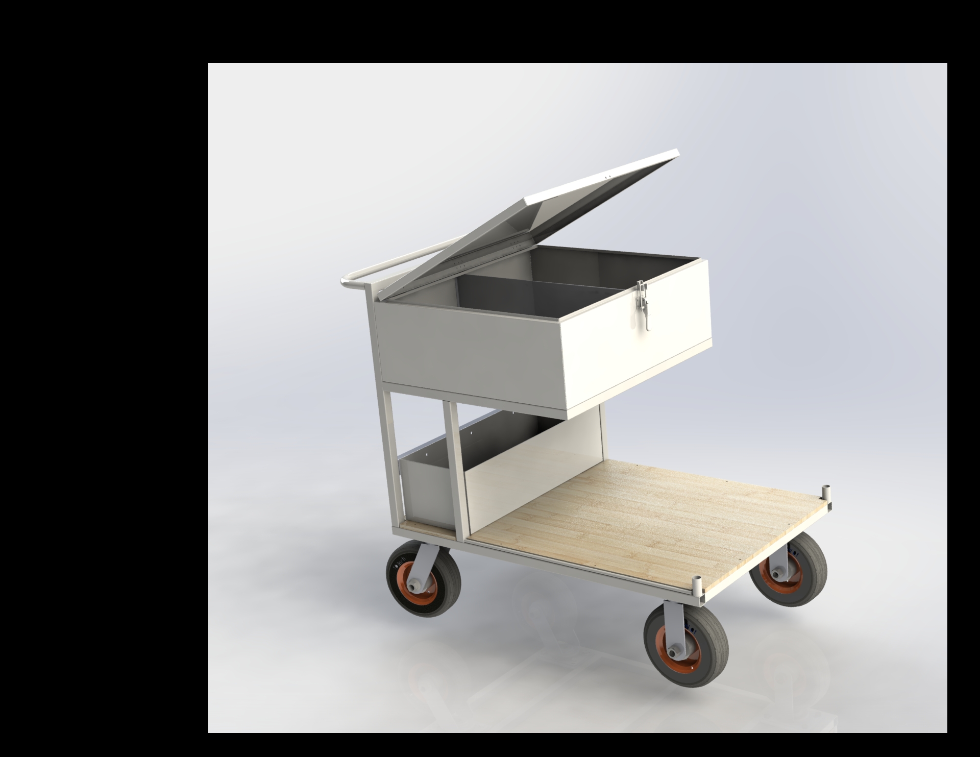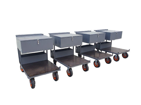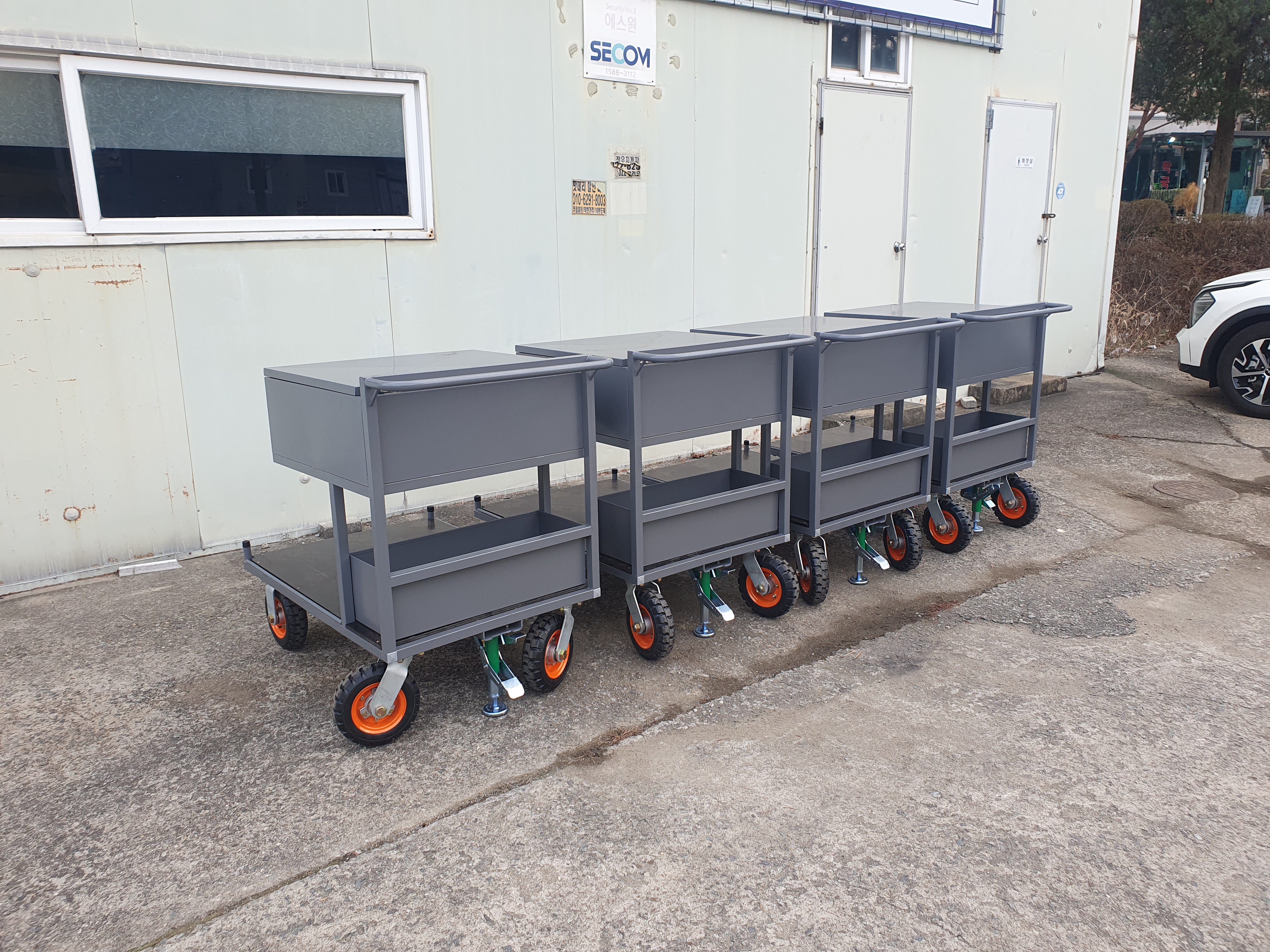 . . 김해공항 공군부대 발주하여 비행장관련 비품을 운반하는 수동형 대차로 상부는 수납형태로 제작하고 하부는 오픈되어 고임목 등을 적재하도록 제작된 수동형대차 입니다. 이씨엠테크(주)에 발주시 요청사항으로 외부에서 사용과 빛 반사가 안되록 제작하고 내구성을 요청하신제품으로 전체 스테인레스로 제작하고 외부에 진회색으로 고열 분체도장하여 외부에서 부식이 최대한 없도록 제작 되었습니다. 문의사항은 010-2512-1593 .