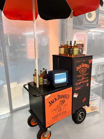 . . 서울에 소재한 클랩피자(CLAP PIZZA)에 출고한 수동형 주문제작 매대로 이씨엠테크(주)의뢰시 클랩피자( CLAP PIZZA) 와 아메리칸 위스키 잭다니엘스 와 콜라보를 주제로한 행사용 매대를 요청하여 제작 하였습니다. 실제 운행도 가능하도록 제작 하였습니다. 주문제작은 이씨엠테크(주) 010-2512-1593